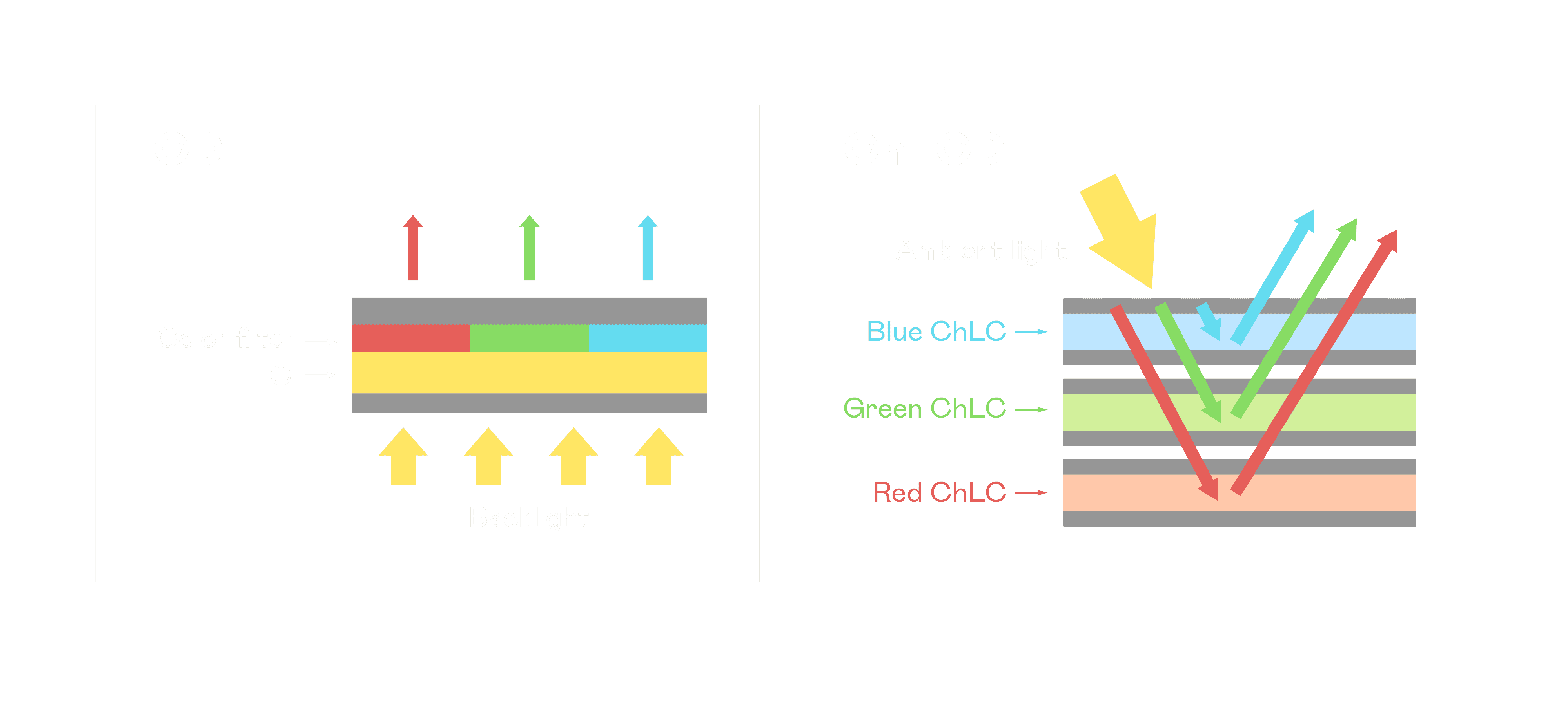 ChLCD 胆固醇液晶就如同纸张一样,,透过反射环境光来显示影像,,因此长时间观看不易造成人眼视觉疲劳,,,,可达到护眼效果。。。。当处于户外阳光下使用,,,LCD 影像容易失真而不易观看,,,但胆固醇液晶仍可维持较佳的影像品质。。。